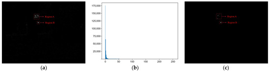 Figure 6 depicts the different images with grayscale histograms of 640 × 480 pixels in the outdoor environment. Figure 6a contains many low pixel regions, and the corresponding histogram distribution is not uniform, indicating that the difference between the background and the grayscale targe values is too large. We divide the difference image into low and high luminance regions to solve this problem. The former region does not affect the threshold segmentation, as only the high luminance region is considered during threshold segmentation. Dividing the gray value between the low and the high luminance region is particularly important. Consider Figure 6 as an example: in the differential image (a), the maximum gray value of the Target A region (pseudo-target area), the Target B (true-target area) region are 198 and 199, respectively. Considering the actual situation, the high brightness reflector gray value is greater than the photoelectric target gray value. Thus, we experimentally found that splitting the high and low brightness region gray values based on the entire image’s highest 1% gray value of the first-pixel point is the most appropriate choice. This value was then used as a threshold to segment the high brightness region: