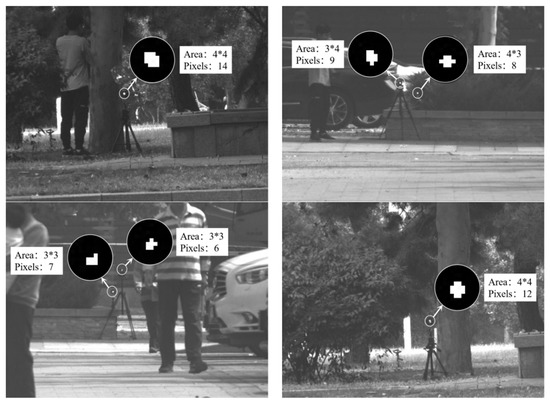 To further improve screening accuracy, the shape characteristics of the photoelectric targets are analyzed, and the shapes of photoelectric targets in different cameras and sites in the dataset are counted. The dataset is 60–80 m apart in an outdoor environment using a 532 nm laser and CCD industrial camera to shoot a conventional camera with a diameter of 20 mm. The image size acquired is 640 × 480 pixels, the photoelectric target is a solid area on the image after threshold segmentation, and the pixel area is between 3 × 3 and 6 × 6. The optical aperture of the photoelectric equipment is mostly circular. Therefore, the shape of the photoelectric target in the image echo signal was considered as solid and approximately circular, as illustrated in Figure 7.