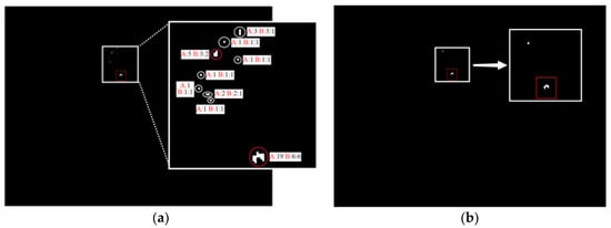 According to the shape characteristics analyzed in the above experiments, the final candidate region was removed from the deformed region with a length-to-width ratio greater than 2:1 and the spot region with an area of fewer than three pixels. The shape measurement before and after the comparison chart is depicted in Figure 8, where the real photoelectric targets are marked with red boxes, parameter A represents the area of pixels occupied, and parameter B represents the aspect ratio. The spot inside the white circle is deleted because it does not meet the shape measurement criteria. Only the spot inside the red circle is retained as a candidate area for the following process.