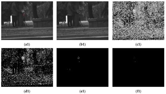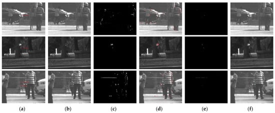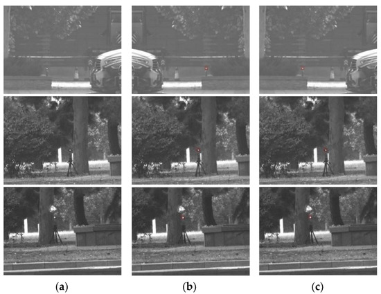 The red areas in Figure 11d,f represent the candidate region detected by the Otsu and the proposed threshold segmentation methods, respectively. The experimental comparison demonstrates that the developed threshold segmentation method significantly reduced the candidate region detected by the Otsu method and accurately contains the real target area. Especially for dynamic scenes, the suggested threshold segmentation method effectively filters out the peoples’ or targets’ relative motion trajectory, preserving the photoelectric target’s characteristic information.