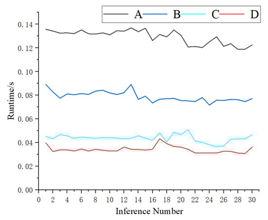 Comparison of running time between single-target area and multi-target area. (A) ShuNet inference for multi-target regions, (B) ShuNet inference for single-target regions, (C) ShuEng inference for multi-target regions, and (D) ShuEng inference for single-target regions.