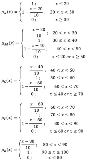 The student’s level of knowledge is determined by five fuzzy sets (N, AB, C, P, and E), varying from 0 to 1. According to the membership functions presented in Figure 2, a student’s score of 41 equals μN(x) = 0, μAB(x) = 0.90, μC(x) = 0.10, μP(x) = 0, and μE(x) = 0, meaning that the quintet (0, 0.90, 0.10, 0, 0) indicates a student is 90% advanced beginner and 10% competent. In case the student’s score is 48, the resulting values are μN(x) = 0, μAB(x) = 0.20, μC(x) = 0.80, μP(x) = 0, and μE(x) = 0, representing a student who is 20% advanced beginner and 80% competent. The last example of a student’s score of 98 results in μN(x) = 0, μAB(x) = 0, μC(x) = 0, μP(x) = 0, and μE(x) = 1, therefore the quintet (0, 0, 0, 0, 1) indicates a 100% expert student. In any case, the equation μN(x) + μAB(x) + μC(x) + μP(x) + μE(x) = 1 stands.