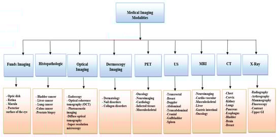Medical images play a critical role in assisting health care workers in reaching patients for diagnosis and treatment. Medical image processing is a set of procedures for extracting clinically useful data from various imaging modalities for diagnosis [63]. Numerous medical imaging modalities include ionizing radiation, magnetic resonance, nuclear medicine, optical methods, and ultrasound as the media. Each modular media has unique characteristics and responses to the human body’s structure [64]. These modalities serve various purposes, such as obtaining images inside the human body or image samples of parts that cannot be seen with the naked eye [65]. The classification of medical imaging modalities and the main types of imaging methods addressed in the surveyed studies are illustrated in Figure 2.
