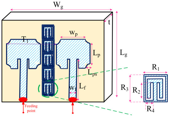 In the first phase, the structure of MIMO is constructed, and after employing the GA method the optimal design parameters are obtained. Figure 5 presents the MIMO antenna structure with the ground plane of 120 mm and 120 mm, along and directions, respectively and Table 2 presents the optimal values of parameters. The presented MIMO antenna consists of two single antennas with rings between two patch-like radiators aiming to reduce the surface waves coupling between them. The MIMO antenna is implemented on the FR-4 substrate with of 4.3 and and loss tangen of = 1 × 10 .