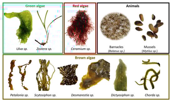To construct the spectral library, we collected samples of the most commonly observed algae and animals for the period (early April) and in the geographical region. In total, nine different species of algae and two types of animals were collected and transported to the laboratory in boxes with seawater. The samples were firstly classified on a species level using a reference catalog [] and a digital microscope. Afterward, the samples were measured with the HSI system to obtain the optical signatures. All the previous measurements of biofouling were made in vivo and ex situ (i.e., in the lab) on the same day. The collected and classified biofouling specimens are shown in Figure 1.