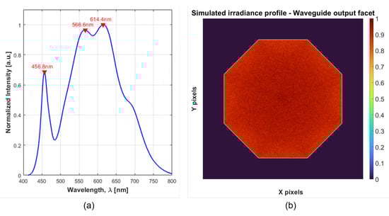 LED emission profiles. (a) Measured spectrum of the LED lamp driven at I = 1.5 A, which covers most of the visible wavelengths, thus overlapping with the LCTF transmission range. (b) Normalized irradiance at the output facet of the octagonal tapered hollow waveguide as simulated in ZEMAX ( analysis rays, 1000 × 1000 pixels detector with 38 mm × 38 mm spatial dimensions, at 0 mm from taper output, smoothing = 2). The Lambertian LED profile was mixed through multiple internal reflections, generating a uniform irradiance pattern at the output facet.