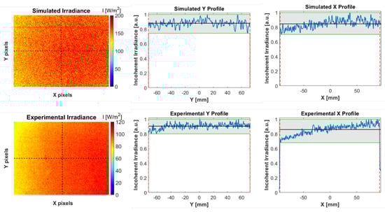 The irradiance map at the surface of the panel was evaluated experimentally by imaging a spatially and spectrally (i.e., color-neutral) uniform target through the system without the LCTF. The target was positioned approximately one meter away from the condenser lens back vertex to completely cover the camera frame while fitting the LCTF FOV. The power was evaluated at the center of the frame with a power meter (S120C, Thorlabs), and was extrapolated considering the relative intensities recorded in the frame. The results are shown in Figure 4 alongside the normalized transverse profiles across the center of the frame. The simulated profiles obtained in ZEMAX under the same conditions (distance to panel, detector size, and resolution) are also shown for reference.