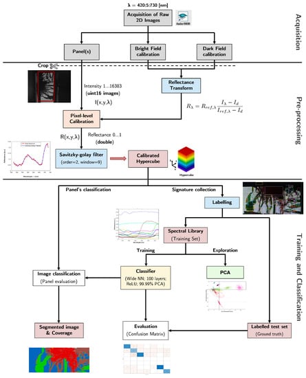 After acquiring a full stack of 2D images indexed to the respective wavelength, the data were processed in MATLAB with custom-built scripts. A simplified diagram representing the workflow is presented in Figure 5. In the first stage, pre-processing was applied to crop the regions of interest (ROIs), convert intensity data to reflectance, and smooth the obtained spectra. Afterward, a classifier was built using a supervised approach with a spectral library as the training set. The classification accuracy was then evaluated using a previously annotated test set as ground truth. The classifier could finally be applied to a new calibrated hypercube to estimate the coverage of each biofouling class on the surface of a panel.