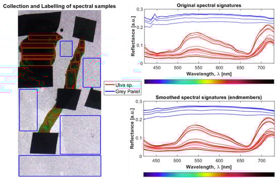 Example of labeling procedure for Ulva sp. and “gray panel” samples. On the left, annotated pixels selected from rectangular regions of interest (ROIs) of the hypercube. On the right, the raw reflectance spectra and respective smoothed spectra. For representation simplicity, each curve represents the average within a ROI, although all enclosed the individual pixel signatures were added to the dataset. The reduction of noisy features through low pass filtering is noticeable (e.g., gray panel at 450 nm); broadband spectral features are preserved. Intra-species variability is visually noticed when comparing the dense multi-layer patch on the top left with the light green section in the center.