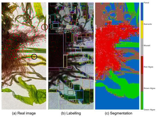 Image of the model target constructed by attaching biofouling collected at the CoaST Maritime Test Centre (CMTC) to a panel coated with a commercial underwater primer. In (a), the RGB image where two algae from different groups are encircled (brown in black circle, green in red circle) to demonstrate that different classes can sometimes depict similarities in color. In (b), the labeling of the measured hypercube to generate the ground truth. In (c), the segmented image resulting from the application of the wide neural network (WNN) classifier to the hypercube.