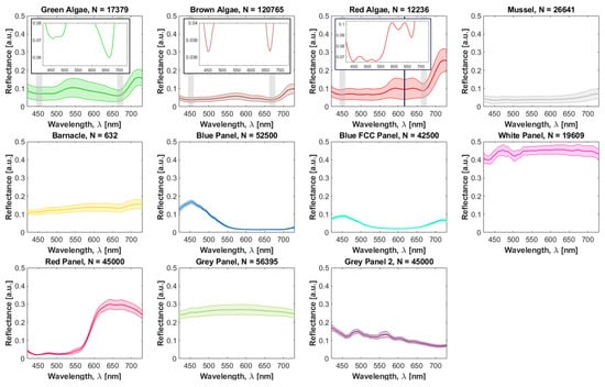 The mean spectra for the coarse groups of the fouling classes are shown in Figure 8. The total number of pixels spectra averaged per class is disclosed in the title of each subplot. The shaded areas represent the standard deviation.
