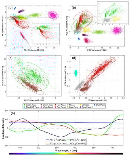 Regarding the algae groups, the spectral similarities were larger, particularly due to the characteristic fingerprints from chl-a in all specimens. Following the same reasoning as before, the datapoints for green and red algae groups have almost no overlap in the PC1 vs. PC2 biplot (see inset in Figure 9a), although there was substantial overlap between the respective confidence ellipses. The ellipses and some datapoints for red and brown algae overlap in all graphs, but the superposition was only slight when PC3 was plotted vs. PC4 (Figure 9d). Among all classes, brown and green algae were expected to introduce the biggest confusion in classification, as there was an overlap between datapoints and ellipses in all the biplots. When considering the first four PCs, the overlap was smallest in the PC2 vs. PC3 biplot (Figure 9c). We observed, in some instances that the brown algae considered in this study had a greenish appearance. For example, the Chorda sp. sample region marked by a black circle in Figure 7a was considered brown algae but had a green-like appearance towards the filaments on the edge, resulting in misclassification as green algae in the segmented image. Likewise, the Zostera sp. marked by a red circle was a green algae, but some regions were darker than others and were confused with brown algae. This is a possible justification for the spectral similarities between these classes.