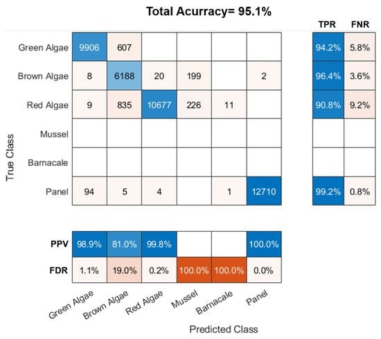 The overall accuracy of the WNN classifier in the model target was around 95.1% (see Figure 10). All the differently colored panels were merged under a single class “Panel” for the purpose of classification since, in practice, the central task was not to discriminate panel colors but rather the percentage of clear surface. On top of it, the color of the panels was well-known prior to submersion. The total training time for the model was around 800 s, while the time it took to classify the 430 × 177 pixels segment of the hypercube was around 135 ms (averaged from 500 measurements).