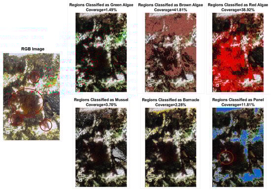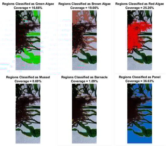 For the evaluation of biofouling on a coated surface, knowledge about the coverage percentage of algae and animals, as well as percentage of clean panel are essential metrics. From the classification results obtained with the WNN model, the coverage percentage for the different classes was calculated as the ratio between the pixels in each class and the total number of pixels. The coverage maps for each class estimated by the classifier on the model target are shown in Figure 11. The coverage of the model target was determined to be 16.66% of green algae, 19.66% of brown algae, 25.26% of red algae, and 36.63% of the panel. The WNN model wrongly classified 0.69% as mussels and 1.09% as barnacles. From the segmented image in Figure 7c, one notices that most of the misclassification occurs at the edges of each object. We speculate that this was mainly due to mixed signatures between two overlapping objects, as for instance panel and algae, which changes the compound spectra and creates confusion in the classification step.