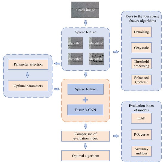 The accurate intelligent identification and detection of road cracks is a key issue in road maintenance, and it has become popular to perform this task through the field of computer vision. In this paper, we proposed a deep learning-based crack detection method that initially uses the idea of image sparse representation and compressed sensing to preprocess the datasets. Only the pixels that represent the crack features remain, while most pixels of non-crack features are relatively sparse, which can significantly improve the accuracy and efficiency of crack identification. The proposed method achieved good results based on the limited datasets of crack images. Various algorithms were tested, namely, linear smooth, median filtering, Gaussian smooth, and grayscale threshold, where the optimal parameters of the various algorithms were analyzed and trained with faster regions with convolutional neural network features (faster R-CNN). The results of the experiments showed that the proposed method has good robustness, with higher detection efficiency in the presence of, for example, road markings, shallow cracks, multiple cracks, and blurring. The result shows that the improvement of mean average precision (mAP) can reach 5% compared with the original method.