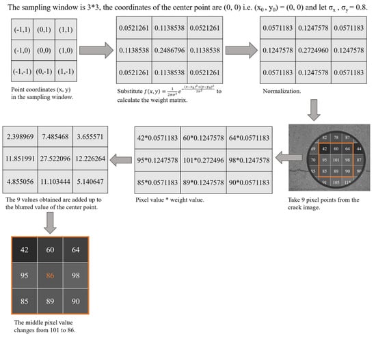 Algorithm1 is a kind of linear smooth filter which can eliminate noise. It is very effective in suppressing noise obeying normal distribution, and is used extensively in image preprocessing. Algorithm1 is processed by convolving the image using a mask whose template coefficients obey a two-dimensional Gaussian distribution that drops as the distance from the template’s center grows. Algorithm1 may retain a lot of visual detail. The two-dimensional Gaussian function is shown in Equation (1) and the pipeline of algorithm1 is shown in Figure 2.