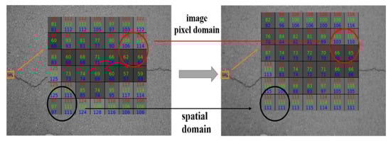 As shown in Figure 4, the crack intersects with the background mainly affected by the image pixel domain kernel, and the crack edge is preserved. And the background is mainly affected by the spatial domain kernel, and the pixels become smooth between them.