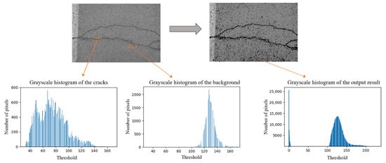 In this experiment, first grayscale the cracked image, intercept the crack and background parts separately and plot their grayscale histograms, then choose the threshold, which was used to divide the image into two parts, above and below the threshold, and give them different pixels. As shown in Equation (6) and Figure 5, src(x, y) indicates the pixel position of the original image, the part above the threshold is retained, and the part below or equal to the threshold takes the minimum value of zero.
