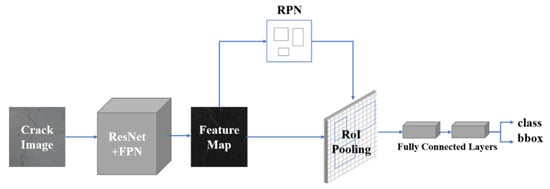 The appearance of cracks is an early warning of road diseases, which will cause more serious traffic problems if not treated in time; therefore, it is especially important to detect cracks in a timely and efficient manner. In this paper, the faster R-CNN algorithm was adopted and improved, which is an efficient and high-accuracy method of detecting cracks in a timely manner.