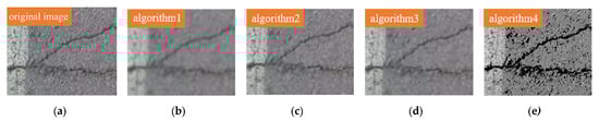 Figure 8 shows the comparison between the original image and the images after sparse feature, where (a) is the original image, and it can be seen that this image has the most detailed information and that there is much redundant information and noise; (b) is the image after algorithm1, and it can be seen that this image is the algorithm of removing the most redundant information, although the image has the disadvantage of blurred edges; (c) is the image after algorithm2, and it can be seen that this image removes part of the redundant information while retaining the crack information well; (d) is the image after algorithm3, in which it can be seen that this image is similar to algorithm2; and (e) is the image after algorithm4, which can be seen that the crack is clearly emphasized.