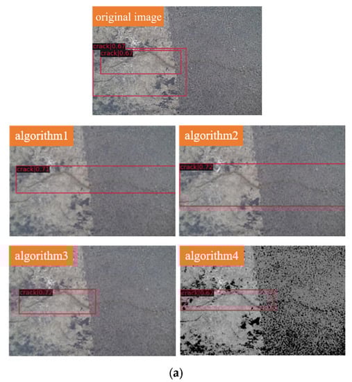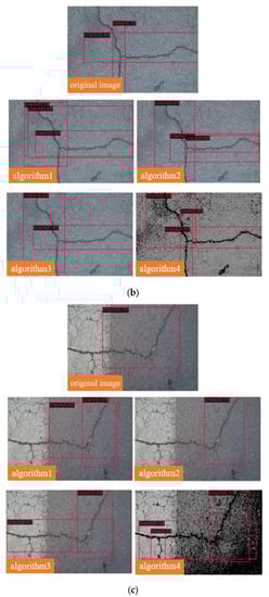Faster R-CNN + algorithm2 has the most obvious improvement, with the mAP increasing from the original 27.8 to 32.8, followed by faster R-CNN + algorithm4, with the mAP increasing to 31.2. mAP50 with faster R-CNN + algorithm1 and with faster R-CNN + algorithm2 improve very significantly to 69.5 and 69.0, respectively. mAP75 with faster R-CNN + algorithm4 improves from the original 18.4 to 26.4. As shown in Figure 7, the redundant information of some images is removed after preprocessing, and in particular, Figure 8c retains the crack features well while removing the redundant information. As seen in Figure 9, the crack images in the testing data have more accurate detection results after preprocessing. We randomly selected two combinations for testing, algorithm2 + algorithm4 and algorithm1 + algorithm2 + algorithm3 + algorithm4, and their mAPs were, respectively, 24.8 and 9.3; we found that these methods were less effective when stacked than when they were when used alone. Based on the results of the experiments, we can conclude that sparse feature is very effective in improving crack detection models.