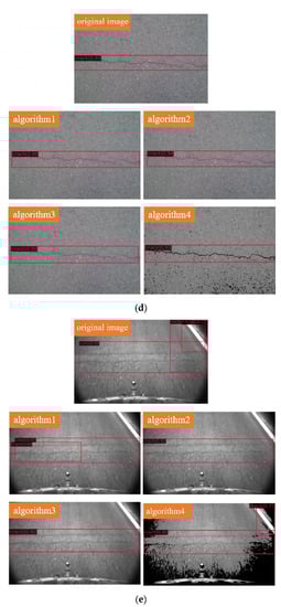 - Algorithm1 is aimed at shallow cracks, with better results for road marking interference, lateral cracks, blurred pictures, and small-area cracks; algorithm2 is aimed at shallow cracks, with better results for road marking interference, multiple cracks, and blurred pictures have better results. With Algorithm3 for multiple cracks, there are better results for road marking interference, lateral cracks, and blurred pictures. Algorithm4 is aimed at multiple cracks, and there are better results for road marking interference and blurred pictures.