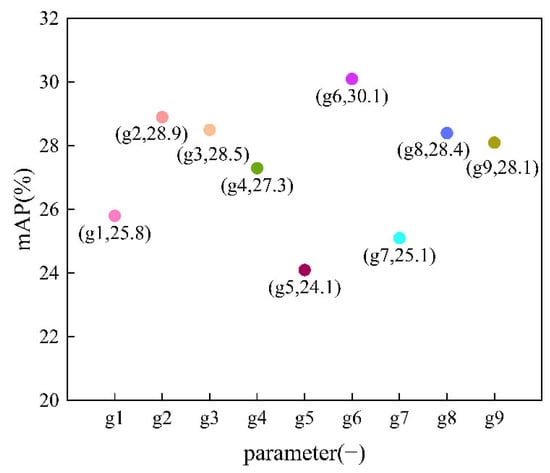 In Figure 10, point (g1, 25.8) indicates that ksize is 3, the sampling window is 3 × 3, is 0.8, is 0.8, and the mAP of the model is 25.8; point (g2, 28.9) indicates that ksize is 5, the sampling window is 5 × 5, is 0.8, is 0.8, and the mAP of the model is 28.9; point (g3, 28.5) indicates that ksize is 5, the sampling window is 5 × 5, is 1, is 2, and the mAP of the model is 28.5; point (g4, 27.3) indicates that ksize is 5, the sampling window is 5 × 5, is 3, is 3, and the mAP of the model is 27.3; point (g5, 24.1) indicates that ksize is 5, the sampling window is 5 × 5, is 10, is 20, and the mAP of the model is 24.1; point (g6, 30.1) indicates that ksize is 7, the sampling window is 7 × 7, is 0.8, is 0.8, and the mAP of the model is 30.1; point (g7, 25.1) indicates that ksize is 7, the sampling window is 7 × 7, is 1, is 2, and the mAP of the model is 25.1; point (g8, 28.4) indicates that ksize is 7, the sampling window is 7 × 7, is 3, is 3, and the mAP of the model is 28.4; point (g9, 28.1) indicates that ksize is 9, the sampling window is 9 × 9, is 0.8, is 0.8, and the mAP of the model is 28.1.