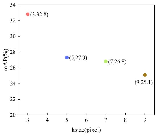 In Figure 11, point (3,32.8) indicates that ksize is 3, the sampling window is 3 × 3, and mAP of the model is 32.8; point (5,27,3) indicates that ksize is 5, the sampling window is 5 × 5, and the mAP of the model is 27.3; point (7,26.8) indicates that ksize is 7, the sampling window is 7 × 7, and the mAP of the model is 26.8; point (9.25.1) indicates that ksize is 9, the sampling window is 9 × 9, and the mAP of the model is 25.1.