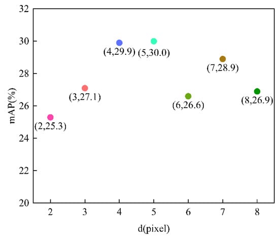 The mAPs of the model with different d were compared, and the experiment results are shown in Figure 12. The horizontal coordinates in Figure 12 represent ksize, and the vertical coordinates represent the mAP of the model. According to Figure 12, as d increases, mAP first increases and then decreases, where mAP is close to and also the highest point when d is 4 and 5, and the mAP reaches 30.0 when d is 5. Algorithm3 can solve the problem of blurred edges appearing in algorithm1, as shown in Figure 8d; the crack features can be well preserved, and the redundant information is removed at the same time. As shown in Figure 9, when the d of algorithm3 is 5, there is a more accurate detection result in the testing data compared with the unprocessed algorithm. In summary, the optimal parameter setting for algorithm3 is d equal to 5.
