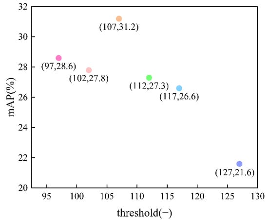 The mAPs of the model with threshold were compared, and the experiment results are shown in Figure 13. The horizontal coordinates in Figure 13 represent the threshold, and the vertical coordinates represent the mAP of the model. Based on experience, the threshold for images is generally set to 127. We first experimented with the threshold of 127, but the mAP obtained was 21.6. After observing the dataset, we concluded that the reason was that the cracks were not prominent enough and not well separated from the background due to setting the threshold too high. Therefore, the threshold was lowered; the range was set between 102 and 117, and the dataset performed better with the cracks more prominent. The method did not differ much from the original dataset after preprocessing when the threshold was set too small and lost too much feature information or even failed to observe the cracks when the threshold was set too large. From the comparison of the results in Figure 13, it is clear that the model has the highest mAP and the best results when the threshold is set to 107. In summary, the optimal parameter for algorithm4 is threshold set to 5.
