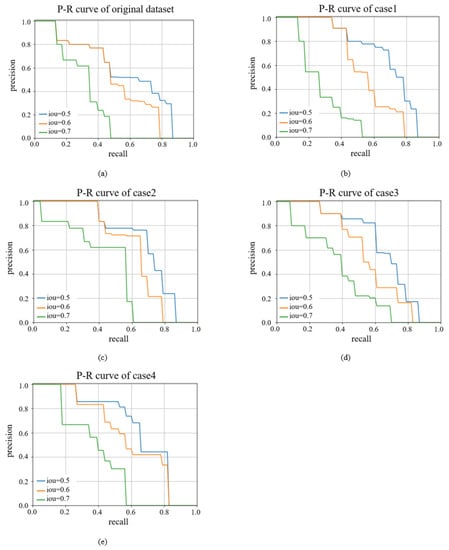 In this section, the comparison of P–R curves of the models trained with the unprocessed dataset and the dataset after four sparse feature algorithms is shown. The P–R curve is the variation in the accuracy and completeness with IoU. IoU, intersection over union, calculates the intersection rate between the predicted border and the real border. Three representative IoUs were selected to show their P–R curves. The P–R curve intersects the x-axis and y-axis to enclose an area, and the larger the area, the better the performance of the model. The results of the P–R curves are shown in Figure 14.