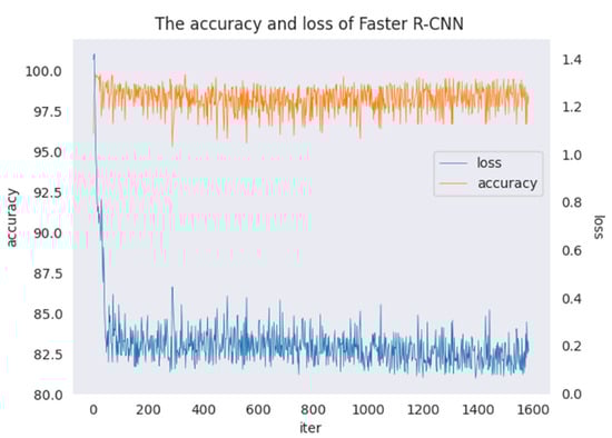 The variations in the accuracy and loss with faster R-CNN according to the number of iterations is shown in Figure 15, where the horizontal coordinates represent the number of iterations, the left vertical coordinates represent the accuracy, the right vertical coordinates represent the loss, the orange dash represents accuracy, and the blue dash represents loss. In Figure 15, it can be seen that the accuracy of faster R-CNN finally stabilized at 98, and the initial loss with faster R-CNN is 1.4, which first decreases rapidly with increases in the number of iterations, then decreases steadily, and finally stabilizes at about 0.2. The variations in accuracy and loss show that the model is trained without any anomaly and the results are good.