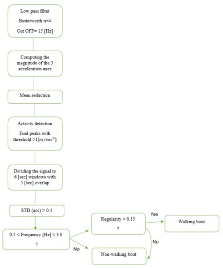 Flowchart based on Keren’s gait detection algorithm []. The raw data were divided into six-second windows. The Euclidean norm of the 3-axis accelerometer signal was calculated to minimize any effects of the sensor’s placement and angle or orientation dependency. An activity threshold was set to 1 () to remove areas in the recording with low activity. Then, each window was classified as a walking bout based on the time and frequency domain features.