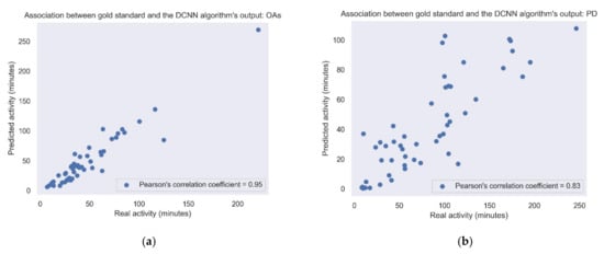 Association between the gold standard and the DCNN model output. Each point represents the sum of the activity for each day. (a) Pearson’s correlation coefficient = 0.83; p-value < 0.001. (b) OAs: Pearson’s correlation coefficient = 0.95; p-value < 0.001. When removing the outlier point in the upper right corner, the Pearson’s correlation coefficient changed to 0.9.