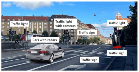 However, few papers [] dig into the performance of the FMCW radar-communication system with multiple tags. The separation between tags is a challenge in this scenario. Paper [] presented proof-of-principle measurements using a brass-board S-band (2.45 GHz) radar with 40-MHz bandwidth, showing simultaneous ranging and demodulation of two tags at ranges of 15 and 33 m in a cluttered indoor environment. This paper studied the multi-tag scenario, and in order to separate information from two tags, tags should be sufficiently physically separated so that two signals at the receiver side will not overlap in the spectrum. When the symbol rate increases, the minimum spacing needs to increase accordingly to avoid the spectrum overlapping. Otherwise, the FMCW chirp signal needs to have larger bandwidth or a shorter sweep time. Both cases require either a hardware update or infrastructure re-installation, which complicates the implementation. Besides the described space division multiple access methods, there are also other solutions to avoid collisions between multiple tags; for example, frequency/code/time division multiple access (FDMA/CDMA/TDMA) [,]. CDMA is a suitable candidate because it does not require a radar hardware update. The multi-tag backscatter communication with the FMCW radar system can be really useful in certain application scenarios. In the next section, we will introduce a smart traffic scenario that could benefit from this system.