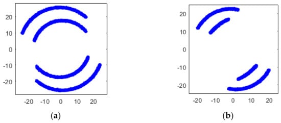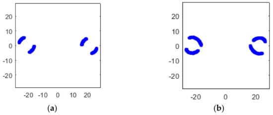 Simulated constellation diagrams of (a) and (b) with of 500 Hz and of 250 Hz.