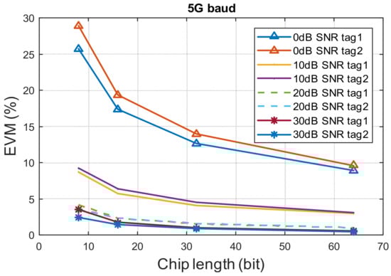 with different lengths from 8 bits to 64 bits. If the signal power from two tags is different due to distance, one signal’s power is less than of the other one, then only one tag’s data can be recovered. Note that this ratio can be further reduced when a suitable signature code is selected. With this group of signature codes, increasing the length of the code doesn’t decrease the ratio between and L significantly. However, increasing the length of the signature code chip can increase the SNR. As a result, the EVM reduces as the length of the signature code increases. A simulation result of the EVM of recovered signal from two tags with different chip lengths and SNR is shown in Figure 8. The chip rate is 5 Gbps. With the increase of chip length, higher signal power is obtained at the receiver side. As a result, the EVM decreases.
