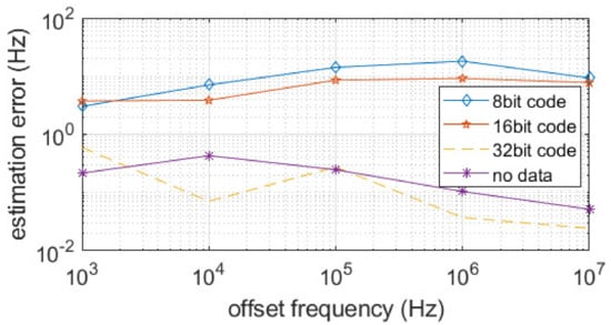 To study how modulated signals affect the radar sensing performance, we assume there is only one tag in the view. The radar sensing performance is related to the offset frequency estimation performance. We apply a two-step frequency estimation; First, apply FFT to get a coarse frequency estimation. Second, a phase-locked loop is applied to further track the frequency and phase offset. Here, we use a BPSK signal with a symbol rate of 5 Gbaud, and SNR of 20 dB. As Figure 9 shows, when the signature code has 8 or 16 bits, there is around a 10 Hz to 20 Hz estimation error. When the signature code has 32 bits, the estimation error is lower than 0.5 Hz, which is similar to no data modulation case. As a result, the SNR is the key factor in frequency estimation.