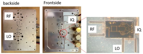 A package solution for the tag is presented in this section. A commercial E-band fundamental quadrature mixer MMIC (Gotmic gMR0012, Gothenburg, Sweden) [] is packaged in a waveguide interfaced block as a tag in the proposed radar-communication system. The LO port is used as a tag input port, the RF port is used for modulated signal output, and baseband IQ ports are used to control theRF port phase-shifting regarding input LO signal. The photo of the packaged module is shown in Figure 10. On the back side of the module, two waveguide ports of WR-8 interfaces are used for signal input and output. 20 dBi waveguide interfaced antennas are connected to the tag during measurement. On the side of the module, differential quadrature IQ input port are provided by coaxial interfaces. On the front side of the module, a 200 um thick metal carrier board with etched slots are used for carrying MMIC and the U-shape slots are used for MMIC to waveguide transition. Also, a printed circuit board (PCB) is used for IQ signal connections to the MMIC.