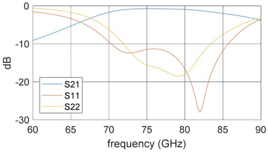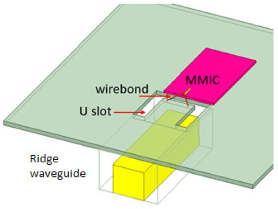Different packaging solutions have been proposed, and many of them require a PCB. PCB introduces big loss at high frequencies, which is desired to be avoided in high frequency packaging solutions [,,,]. A novel substrate-less packaging solution is proposed in the design of the tag module. The LO and RF ports are directly wire bonded to the packaging block without using any dielectric substrate to reduce cost and avoid high electric loss at these frequencies. The packaging concept is illustrated in Figure 11. A ridge waveguide is used at the interface, whose upper wall is cut open with a U-shape slot. The upper wall (green part) is 200 um thick metal carrier which also holds MMIC on it. The ridge (yellow part) is manufactured by milling on a metal block (backside of the module, invisible in this figure). The MMIC is attached above this upper wall, and the signal PAD on the MMIC is connected to the upper wall with two bonding wires across the U-slot. These bond wires act as radiation probes, and the U-slot provides a coupling between the bond wire and the ridge waveguide. The length of this slot defines the coupling frequency. From the ridge waveguide to standard rectangular waveguide, a transition as described in [] is used. This transition’s S parameter measurement result is presented in Figure 12, where port 1 is the lumped port on the MMIC and port 2 is the wave port at the ridge waveguide. The measurement exhibits insertion-loss less than 2 dB and return-loss less than −10 dB between 70–85 GHz.