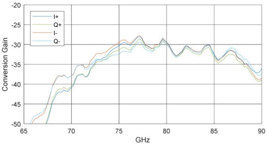 The mixer used as a tag is a resistive mixer where the LO signal is split into quadrature paths, where different attenuation is applied on the path based on IQ input, and these paths are then combined into RF output. This operation principle implies an energy loss converting an LO signal to an RF signal. The packaged module is tested with −10 dBm LO input power and 1 GHz input at four different baseband ports (I+, I−, Q+, and Q−) independently. The conversion gain is plotted versus different LO frequencies in Figure 13. It can be seen that the mixer introduces a 35 dB conversion loss over the 70–90 GHz band.