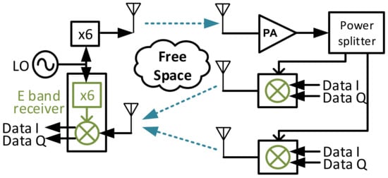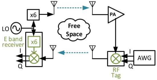 The LMF signal is generated from a signal generator (Agilent E8257D, Santa Clara, CA, USA) with a frequency between 12.533 GHz and 13.033 GHz. The chirp rate is 0.1 Hz. An E-band six times multiplier (AT Microwave AT-AM6-7186-12, Shanghai, China) is connected after the signal generator to generate the FMCW signal with a frequency from 75.2 GHz to 78.2 GHz. The FMCW signal is sent out through an antenna over the air. At the tag side, the FMCW is first amplified by a W-band power amplifier (QuinStar QPI-W01128, Torrance, CA, USA). An arbitrary wave generator (AWG, Keysight M8195A, Santa Rosa, CA, USA) is used to generate the baseband I/Q signal. The amplified FMCW signal is mixed with the baseband I/Q signal by the self-packaged RF tag. The RF signal is sent back to the radar side. On the radar side, an E-band receiver module (Gotmic gRSC0015, Gothenburg, Sweden) [] is used to down-convert the RF signal. The module comprises a six times multiplier and a mixer. The FMCW signal is generated inside the receiver module by the multiplier and mixed with the received RF signal. The down-converted signal is sampled by an oscilloscope (Teledyne LabMater 10 Zi-A, Thousand Oaks, CA, USA) for further post-processing. The EVM and BER are estimated by the oscilloscope. The oscilloscope and the AWG are not synchronized and running freely. The measurement distance between antennas from the radar side to the tag side is around 65 cm.