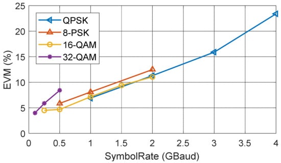 Signals with different modulation schemes have been transmitted over this backscatter communication system. The highest transmitted data rate is 8 Gbps with QPSK or 16-QAM. The highest tested modulation order signal is a 32-QAM signal with a data rate of 2.5 Gbps. Constellation diagrams of different modulation signals with their highest data rate are shown in Table 2. Their estimated EVM with different symbol rates are shown in Figure 15. Their BERs are all below 2 × 10−4. These measurement results show that the self-package tag is capable of transmitting a large bandwidth signal of 8 GHz and high modulation order signal of 32-QAM.