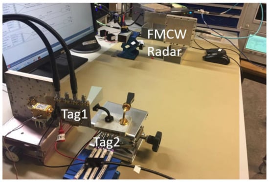 A pair of I and Q channel is used for each tag with an input power of −10 dBm at each channel. The conversion loss is around 30 dB at the frequency that we used. The RF output power from the tag is around −37 dBm. Antennas in use for two tags have 25 dBi and 20 dBi gain, respectively. On the radar side, the slot array antenna provides 22 dBi gain. The received signal power at the radar side from each tag is −56.4 dBm and −61.4 dBm, respectively.