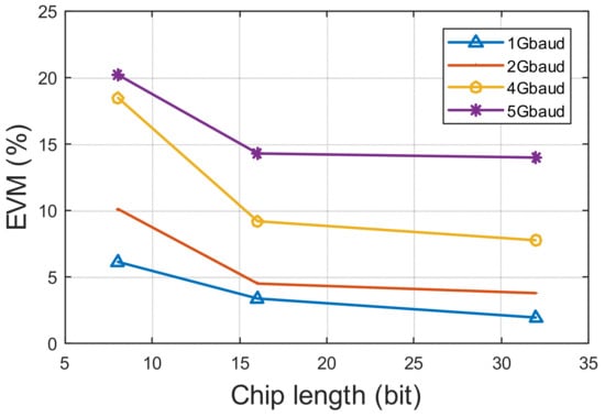 EVM VS. different chip length and different symbol rate of two-tag measurement.
