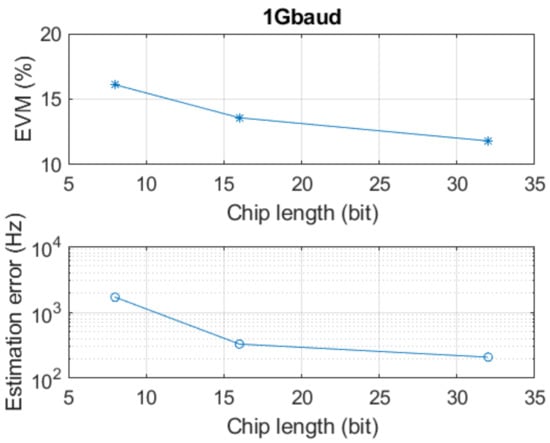 Due to the limited measurement distance in the lab and the slow sweep time of the signal synthesiser, the offset frequency at the receiver side is very small. To further test the system performance with larger offset frequencies, offset frequencies of 50 kHz and 49 kHz are added from the tag side by AWG. As Figure 20 shows, EVM and frequency estimation error decrease with chip length increase. Comparing Figure 19 and Figure 20, when using the same symbol rate signal in the system, higher offset frequencies cause higher EVM. For the 1 Gbuad signal used in the system, the EVM increase by around 10% when offset frequencies exist. If an FMCW with 1 GHz bandwidth and 1 ms duration time is used in this system, the frequency estimation error shown in Figure 20 will cause a 60 mm to 500 mm range estimation error with different chip lengths. This is due to an immature frequency estimation solution, and it can be further improved with more advanced processing methods.