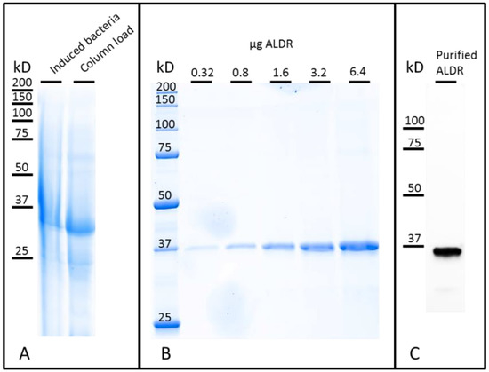 Figure 2. ALDR electrophoresis analysis. (A) Total protein before purification (CBB). (B) Observation of different quantities of purified ALDR (CBB). (C) Visualization of the purified ALDR using western blotting.