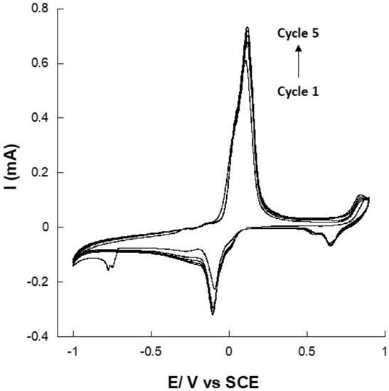 Representative cyclic voltammograms at 10 mV·s−1 for electropolymerization of poly(Methylene Green) (PMG) on the electrode surface are presented in Figure 3. The oxidative peak of MG was observed at +0.1 V in the first cycle and at +0.11 V in the 5th cycle, vs. Ag/AgCl. In the same way, the reduction peak shifted to the negative’s values, and its intensity increased in absolute terms. These shifts of the oxidative and reduction peaks and the increasing of the current intensity indicate that an oxidative polymerization was taking place and that more electroactive species were being deposited on the surface of the electrode [26,33,34].