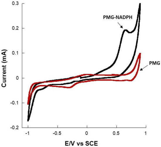 The modified gold-electrodes were tested for their ability to catalyze the oxidation of NADPH. Indeed, PMG has been previously used as an NADH and NADPH regeneration matrix [35,36]. Here, cyclic voltammetry (CV) experiments were undertaken with PMG-modified gold electrodes at 2 mV·s−1 to determine the potential at which the electro-oxidation of NADPH takes place. As expected, the CV of a PMG modified electrode in the presence of NADPH presented an oxidation peak at +0.62 V (Figure 4), in agreement with results reported on the electro-oxidation of NADPH and in agreement with reported studies on the capacity of PMG, like other azine dyes, to regenerate NADPH [36,37,38].