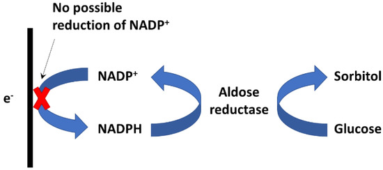 The work presented here investigates the possibility of performing electrochemical detection of glucose through its reduction by aldehyde reductase. Aldehyde reductase is known to be an NAD(P)H-dependent enzyme that catalyzes the reduction of an aldose to the corresponding sugar alcohol, in particular, D-glucose to sorbitol. Aldose reductase is involved in the polyol pathway, catalyzing the conversion of glucose to sorbitol, which is subsequently converted to fructose by sorbitol dehydrogenase (Figure 1).